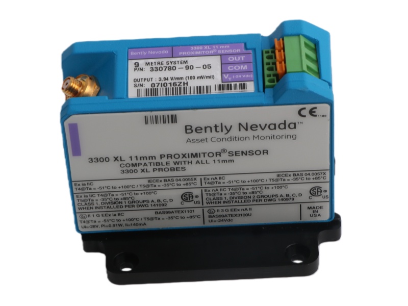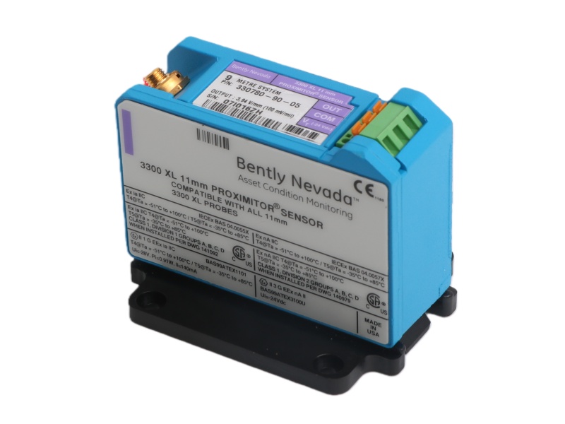 The 330780-90-CN Bently Nevada 3300 XL 11 mm Proximity Sensor is a 3300 XL series, 11 mm Proximitor Sensor with a 9.0-meter system length. It is designed for panel mount installation in vibration monitoring systems and carries multiple international approvals for reliable operation.