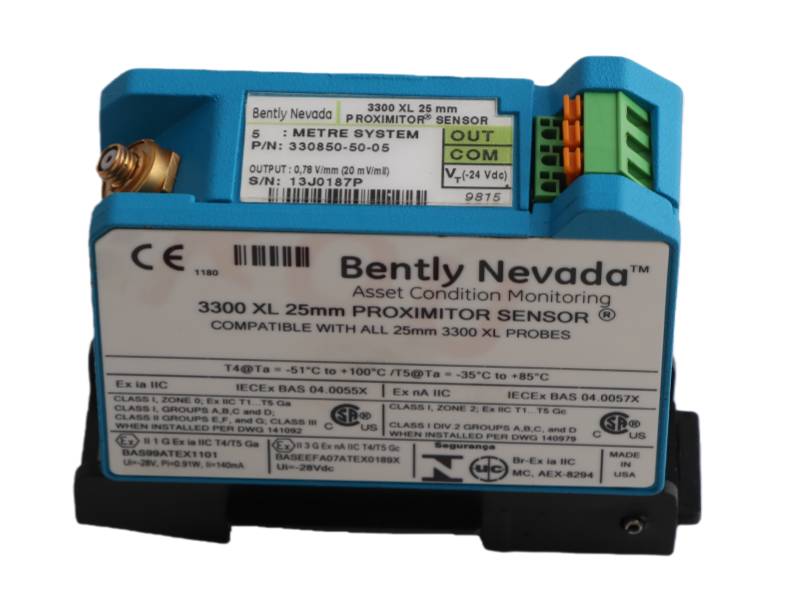 The Bently Nevada Proximity Sensor 330850-50-CN is a 25 mm panel-mount Proximitor Sensor, part of the 3300 XL NSv system designed for tight-clearance machinery. It provides 5-meter signal conditioning for radial vibration and axial position measurements.