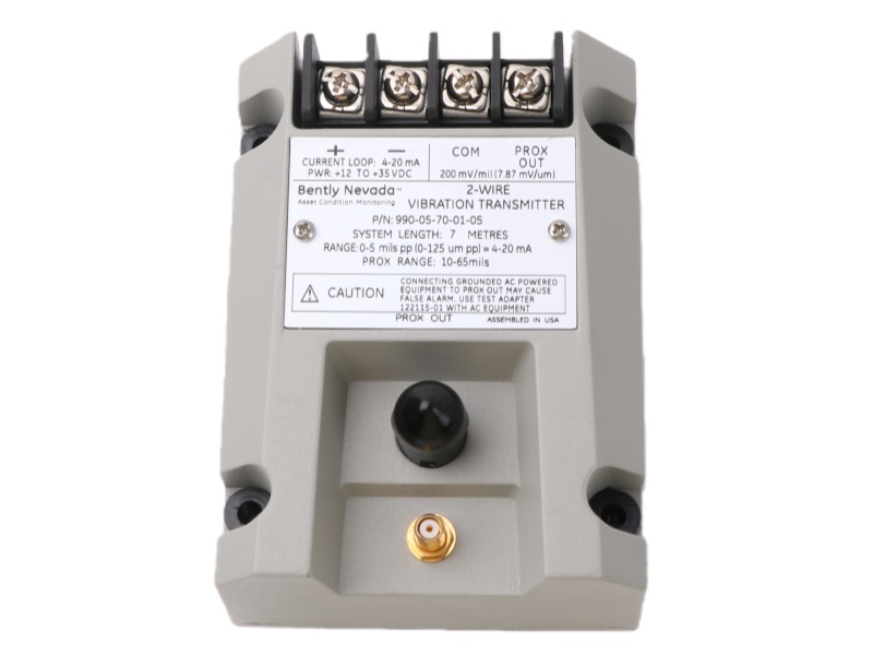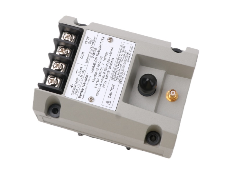 The Bently Nevada 990-05-70-01-CN vibration transmitter provides a 4-20 mA output and a PROX OUT diagnostic signal. It features a 35 mm DIN rail clip, CSA/ATEX hazardous area approvals, and a 7-meter sensing range.