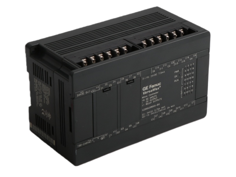 The General Electric IC200UDR005-CH is a 28-point VersaMax micro PLC powered by 120/240 VAC. It features 16 digital inputs, 11 relay outputs, and one 24VDC output.