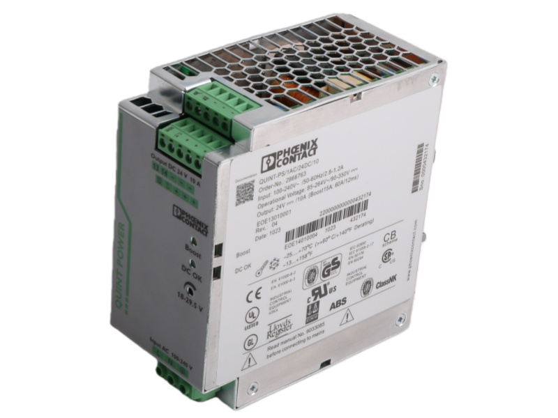 The PHOENIX power supply QUINT-PS/1AC/24VDC/10 2866763 is a power supply delivering 24VDC/10A, renowned for its SFB technology. This ensures superior system availability by selectively isolating faults and providing high inrush current for reliable load switching.
